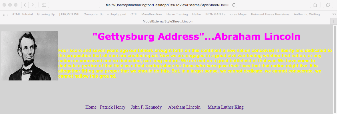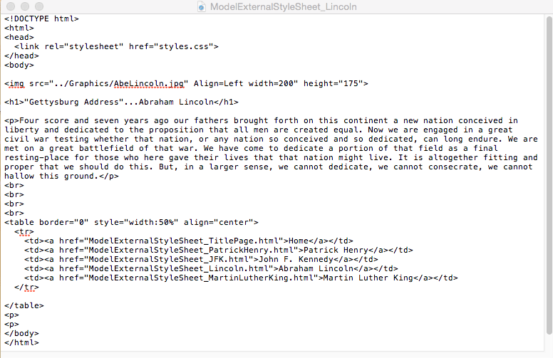 Contains: Browser Window Image of the Lincoln Page / Home Page Code / Text / Image