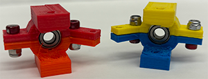 - Now connect the Left Steering Column/Rack to the Base Plate. Line up the hole on the base of the left Steering Column with the holes on the left side of the Base Plate (Take a look at the Class Models or images (left ). Connect the Steering Column to the Base with a screw (m3 #14/orange), with washers and locking nut. Again, tighten just enough so that the screw sticks in the plastic of the Locking Nut - you want the Steering Column to turn easily. I use the washers to keep plastic from touching plastic - this allows the steering column to turn more smoothly