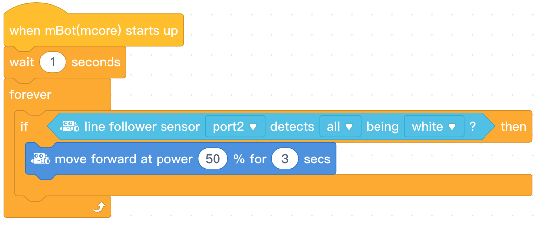 2. Write a program so that when the line sensor sees the color white on both sensors at the same time ("all"), the robots wheels begin to move forward for 3 seconds.