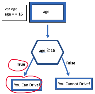 - Second: Create a Flowchart (Class Board!) for your scenario, like the last class, in which we start with a Variable, then the Expression which should include the Operator and then the outcome showing if True then one result and if False, then another result. Include Arrows. Present two values, one that will fail and one that will succeed. Example